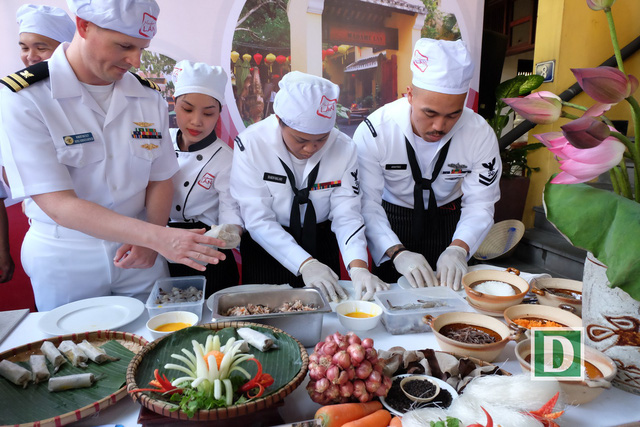Tàu sân bay USS Carl Vinson tới thăm Việt Nam đang ở Đà Nẵng và được ăn những món truyền thống của địa phương như mì Quảng, bánh xèo, ram cuốn. Đầu bếp của họ sau khi nếm thử hương vị của các món ăn này đã rất hào hứng học chế biến.