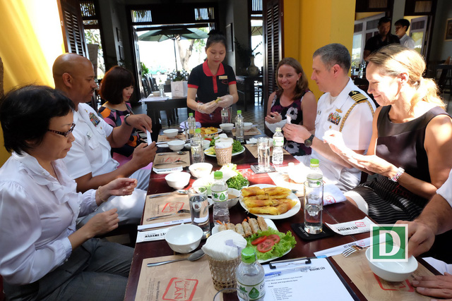 Chiều 6/3, tại Đà Nẵng - các đầu bếp trên tàu sân bay USS Carl Vinson - những người có thể chế biến 5.000 suất ăn 4 lần mỗi ngày trên tàu đã có một buổi giao lưu, trải nghiệm ẩm thực địa phương tại một nhà hàng có phong cách truyền thống Việt Nam ở Đà Nẵng.