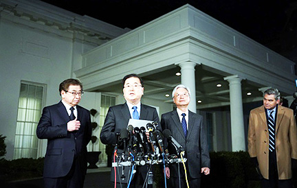 Cố Vấn An Ninh Quốc Gia Nam Hàn Chung Eui-yong (giữa) đang nói với báo chí bên ngoài Tòa Bạch Ốc đêm thứ Năm, rằng lãnh tụ Bắc Hàn Kim Jong Un đã mời Tổng Thống Donald Trump dự một cuộc gặp gỡ giữa hai người, và ông Trump đã nhận lời. Đây sẽ là lần đầu tiên trong lịch sử có một tổng thống Mỹ gặp mặt một lãnh tụ Bắc Hàn. Đứng cạnh ông Chung là Trưởng Phòng Tình Báo Quốc Gia Nam Hàn Suh Hoon (trái) và Đại Sứ Cho Yoon-je (thứ nhì từ bên phải). (Getty Images)
