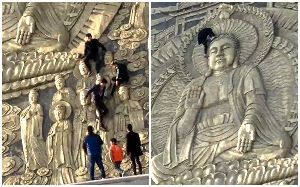 Theo đó, để có những bức hình kỉ niệm đẹp nhất, một nhóm du khách nam sẵn sàng trèo lên các bức tượng Phật điêu khắc ở chốn linh thiêng. Theo những bức hình được chia sẻ trên mạng có thể thấy nhóm người này sẵn sàng trèo qua đầu, vai những bức tượng phật nhỏ để leo lên vị trí của bức tượng Phật lớn nhất.