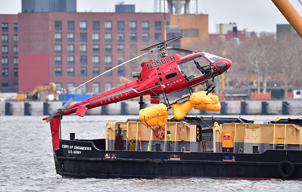 Chiếc trực thăng được trục vớt ra khỏi sông East River tại thành phố New York ngày thứ Hai, 12 tháng Ba, 2018. Phi công đã thoát chết, trong khi năm hành khách bị chết đuối. (James Devaney/ Getty Images)