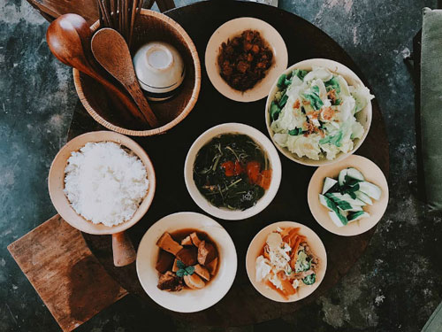 Món ăn ở đây cũng rất giản dị, "hương đồng gió nội" với các đặc sản như cơm cá kho tộ, thịt kho trứng, rau luộc, đậu rán, canh chua, cà muối... đặt xinh xắn trong bộ bát đũa cũng "từ thế kỷ trước". Vào ngày rằm mùng một, quán còn bán thêm các món chay tịnh như đậu hũ kho nấm hoặc sốt cà, măng xào giá đỗ, giá đỗ xào nấm, chả ram chay, canh giá hẹ... Thực đơn các món mặn cũng thay đổi hàng ngày, mang đến cảm giác như đang ăn cơm nhà chứ không phải ăn ở nhà hàng mâm cao cỗ đầy. Khẩu phần mỗi món cũng rất vừa vặn, nhỏ xinh, không quá nhiều nên bạn sẽ không có cảm giác no hay quá thừa thãi.