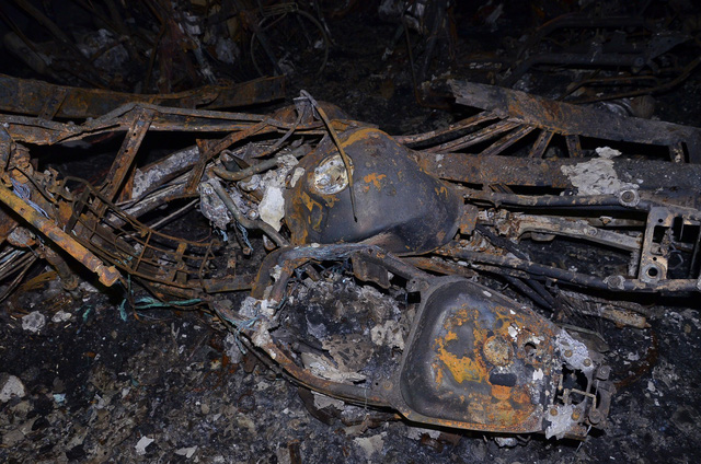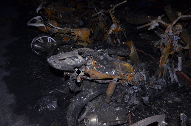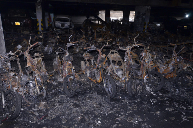 Mới đây công an đã hoàn tất việc khám nghiệm hiện trường vụ cháy chung cư Carina Plaza. Cư dân chung cư đã được vào tầng hầm để lấy xe ra ngoài sửa chữa. Dưới đây là hình ảnh ô tô, xe máy bị cháy trong tầng hầm chung cư Carina Plaza.