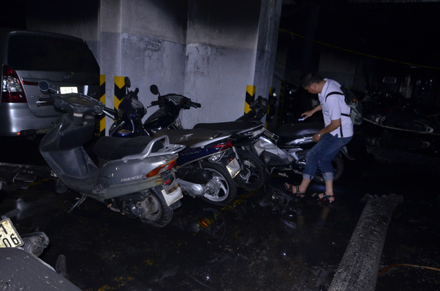 Đa số những xe để trong tầng hầm đều bị bụi đen phủ kín, trong đó nhiều xe bị cháy xém cũng được người dân di chuyển ra ngoài để làm việc với bảo hiểm, tính toán phương án đền bù, hỗ trợ.