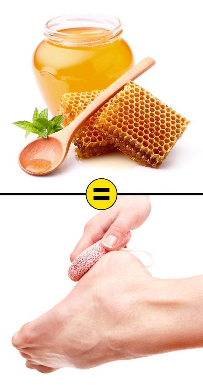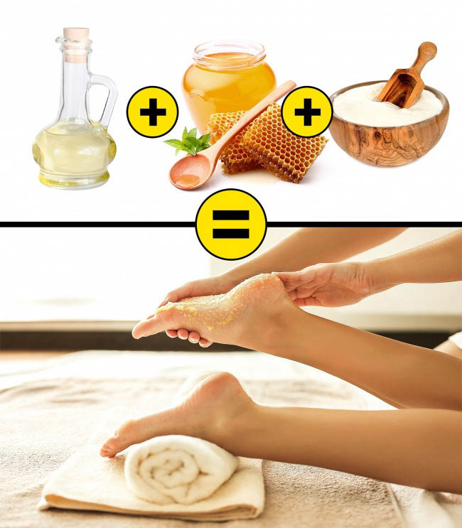Trộn 3 thìa bột gạo, 1 thìa mật ong và 2-3 giọt giấm táo, khuấy đều. Ngâm chân trong nước ấm khoảng 10 phút, bôi hỗn hợp trên vào rồi cọ sạch để loại bỏ da chết. Nên làm từ 2-3 lần/tuần.