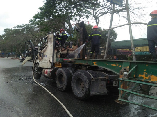 Ngay sau đó, lực lượng cảnh sát PCCC đã điều động xe cứu hỏa đến hiện trường dập lửa. Tuy nhiên, khi ngọn lửa được dập tắt thì phần đầu chiếc xe đầu kéo container đã bị cháy rụi, biến dạng hoàn toàn.