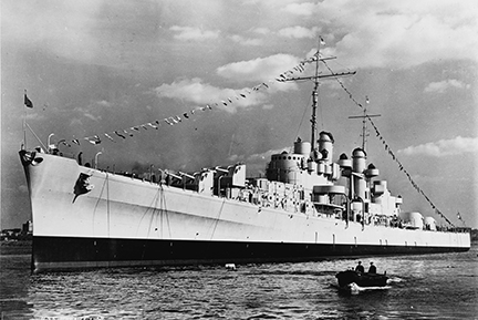 Chiếc USS Juneau khi mới khánh thành tại xưởng chế tàu ở Kearny, New Jersey, ngày 25 tháng 10, 1941. (Public domain photo courtesy Bureau of Ships Collection/ U.S. National Archives)