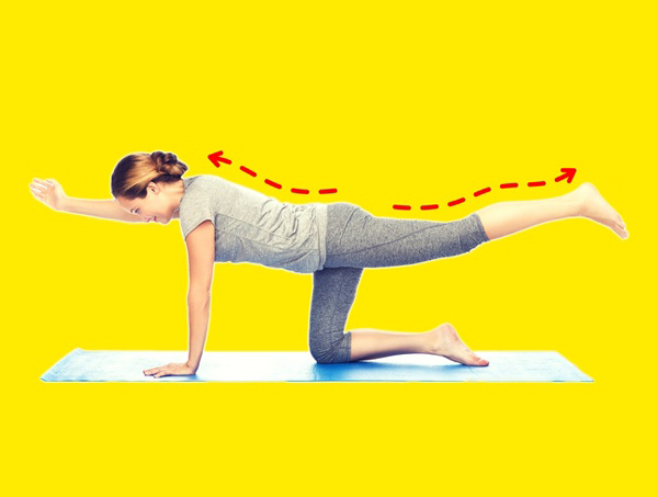 Quỳ gối trên thảm, hai tay chống vuông góc với thân. Từ từ hít vào, đạp một chân ra phía sau, tay bên ngược lại đưa thẳng về phía trước, giữ khoảng 10 giây rồi nhẹ nhàng thở ra, trở về tư thế chuẩn bị. Lặp lại động tác 20 lần mỗi bên.