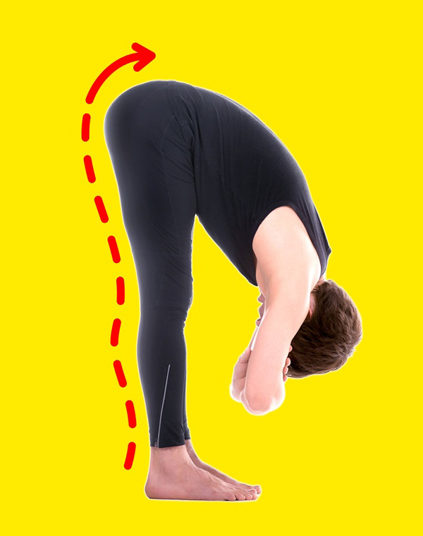 Đứng thẳng người, hai chân chụm. Từ từ hít vào, đan hai tay ở trước trán, cúi gập người hết mức có thể, chân giữ chẳng. Giữ khoảng 10 giây rồi thở ra nhẹ nhàng, trở về tư thế chuẩn bị. Lặp lại động tác 30 lần.
