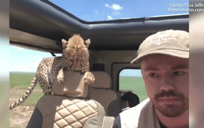 Theo Daily Mail đưa tin, trong khi đang lái xe tại khu safari Grand Ruaha, Tanzania, anh Britton Hayes đã "chết đứng" khi thấy một con báo cheetah nhảy chồm lên sau xe jeep của mình.
