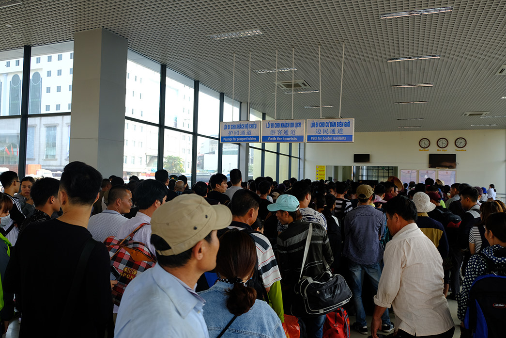 Từ sáng sớm mỗi ngày, hàng nghìn khách Trung Quốc đã xếp hàng dài bên phía Đông Hưng chờ làm thủ tục nhập cảnh Việt Nam. Do cầu Bắc Luân 1, cầy cầu nối Việt Nam Trung Quốc khá hẹp, người và phương tiện càng phải chen chúc.
