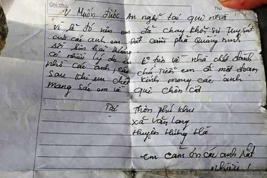 "...Có nhiều lý do em không tiện về nhà chết, đành nhờ các anh các chú tiễn em đi một đoạn. Sau khi em chết, kính mong các anh mang xác em về quê chôn cất. Tại thôn Phú Khu, xã Văn Lang, huyện Hưng Hà, tỉnh Thái Bình...".