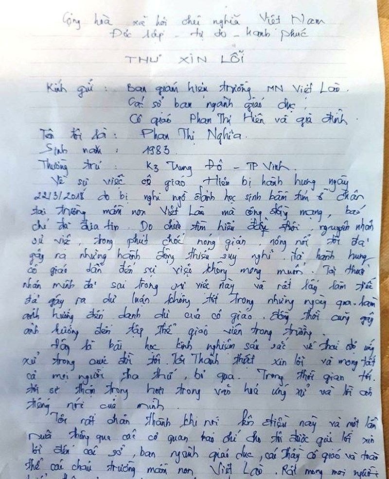 Bà Nghĩa đứng lên cầm lá thư viết tay kín mặt giấy A4 đọc lời xin lỗi và cho rằng: “Ngày 22-3, do nghi ngờ đánh học sinh bầm tím ở chân tại Trường Mầm non Việt-Lào... Do chưa tìm hiểu đầu đuôi, nguyên nhân sự việc, trong phút chốc nóng giận, nông nổi, tôi đã gây ra những hành động thiếu suy nghĩ. Đã hành hung cô giáo dẫn đến sự việc không mong muốn.