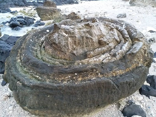 Khối hóa thạch nặng đến hàng tấn, đường kính từ 2 mét trở lên. Nó giống như chiếc cối xay với vòng đồng tâm bắt mắt mà người Bắc Bộ thường sử dụng.
