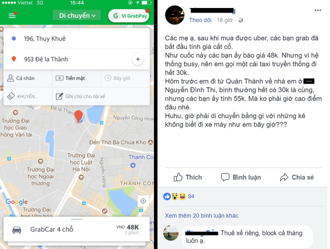 Không thể chấp nhận nổi cách tính giá cước của Grab những ngày này là cảm giác chung của nhiều người. Trên mạng xã hội, các tài khoản than trời về cước phí Grab không hiếm, không ít ý kiến chọn "cạch mặt" Grab, quay về taxi và xe ôm truyền thống.