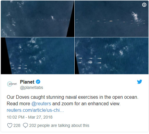 Các bức ảnh vệ tinh được phát hành tuần trước cho thấy tàu Liêu Ninh là một phần của một đoàn tàu khổng lồ với hơn 40 tàu chiến và tàu ngầm ra khỏi đảo Hải Nam.