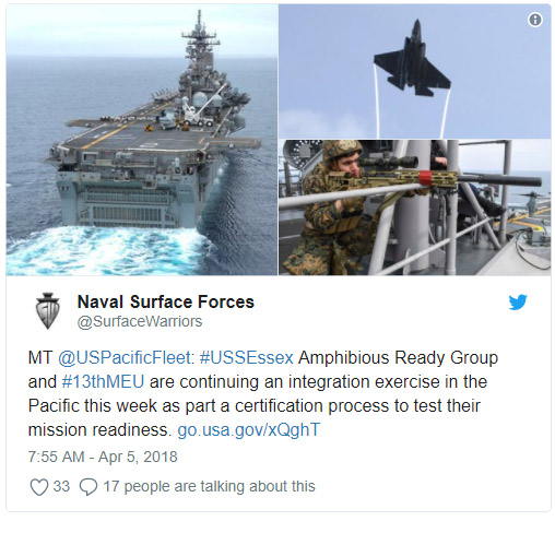 Nhóm tàu USS Theodore Roosevelt đã tới Singapore hôm thứ Hai (2/4), sau khi dàn trận tại Trung Đông, dường như nó tiến hành tập trận với 2 nhóm tàu Hạm đội 7 của Hoa Kỳ (USS Ronald Reagan và USS Carl Vinson)