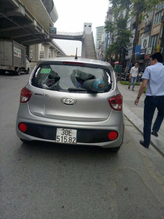 Vụ tai nạn xảy ra tại ngã tư Khuất Duy Tiến-Nguyễn Trãi. Một chiếc xe ô tô Grabcar chở 3 người khi đang chạy dưới đường sắt Cát Linh-Hà Đông bất ngờ bị chiếc bình ô xy rơi trúng, xuyên thủng kính hậu.