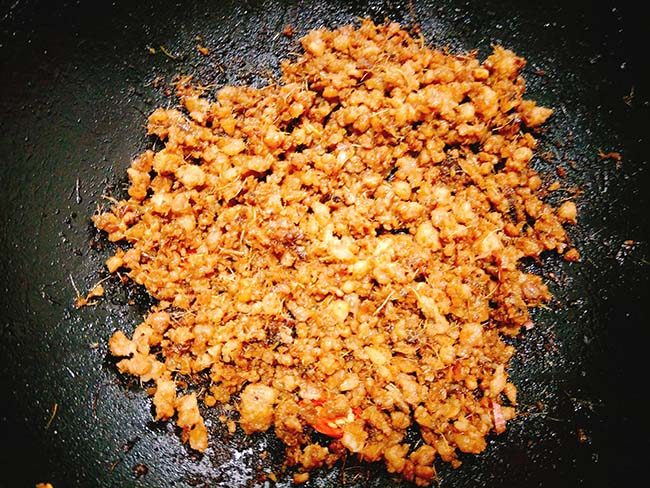 - Bước 3: Cho thịt băm vào xào và đảo đều cho đến khi thịt tơi ra, cho hành và tỏi băm vào xào cùng cho nguyên liệu dậy mùi thơm. Khi nào thịt băm chuyển thành màu vàng xém cạnh thì đổ riềng và ớt vào cùng, đảo đều và nêm mếm cho vừa ăn rồi tắt bếp.