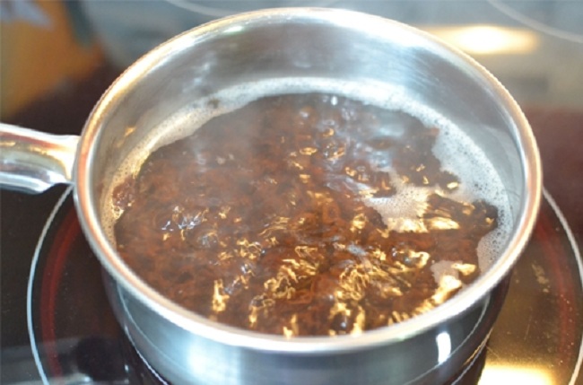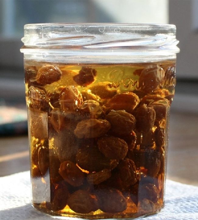 Tiếp theo, cho nho khô vào nồi, thêm vào 3 bát nước rồi đun sôi trên bếp lửa lớn trong khoảng 2 phút. Sau đó, tắt bếp và đổ hỗn hợp nước nho vào một bình thủy tinh, để qua đêm.