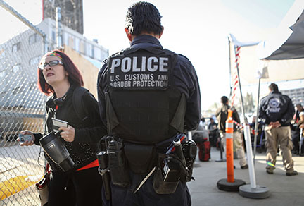 Một cảnh sát viên thuộc cơ quan Quan Thuế và Bảo Vệ Biên Giới đang đứng canh gác tại trạm nhập lãnh thổ Hoa Kỳ dành cho người đi bộ tại San Ysidro, California ngày 9 tháng Tư, 2018. Chính phủ Trump đã yêu cầu các tiểu bang phải đưa lực lượng Vệ Binh Quốc Gia đến canh gác đường biên giới dài 3,200 cây số giữa Mỹ và Mễ Tây Cơ. (Mario Tama/ Getty Images)