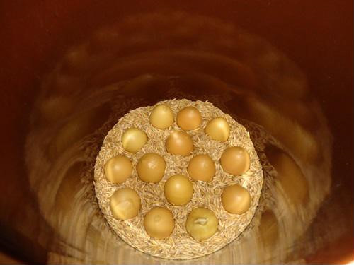 Mùa hè không được để vò hoặc bình đựng trứng ở chỗ có ánh nắng mặt trời chiếu vào mà phải để nơi râm mát, thoáng gió. Mùa đông không để nơi quá lạnh nhưng cũng phải đảm bảo thoáng mát. Cũng có thể cho trứng vào nước vôi có nồng độ khoảng 5% ngâm nửa tiếng rồi vớt ra phơi khô trước khi cho trứng vào bình hoặc vò cất giữ, làm như vậy có thể bảo quản trứng trong thời gian khá dài.