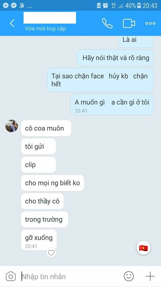 "Em phát hiện ra nó yêu 1 lúc 2-3 người và lừa em. Nó có quay trộm clip của em từ lúc nào giờ mang ra dọa. Tin nhắn và hình ảnh em có đủ bằng chứng. Giờ em nên báo công an hay là nên đòi?" - M.T chia sẻ.