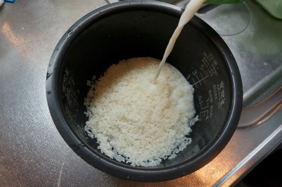 - Đầu tiên, vo sạch gạo rồi cho vào nồi rồi đổ sữa vào xâm xấp mặt gạo.