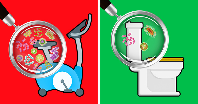 Một nhóm nghiên cứu đã chỉ ra nguy cơ nhiễm trùng ở phòng tập thể dục còn lớn hơn nhiều so với nhà vệ sinh công cộng. Nhóm này đã tìm thấy vi khuẩn trong phòng tập gym nhiều gấp 326 lần so với bất cứ chỗ nào trong WC. Ngoài ra, hơn 70% vi khuẩn có khả năng gây nguy hiểm cho sức khỏe cũng đều xuất hiện ở phòng tập gym.