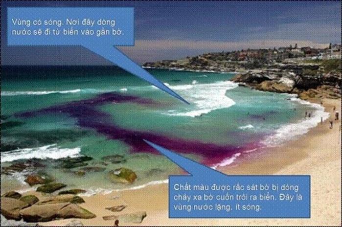 Trong một thí nghiệm, người ta rắc chất màu sát bờ biển và quan sát thấy chất màu bị kéo ra xa bờ. Điều này chứng tỏ nơi đó dòng nước đi ngược từ bờ ra biển. Bên cạnh đó, chúng ta cũng thấy rằng nơi dòng nước đi từ bờ ra biển là vùng nước lặng, hầu như không có sóng. Đây là điều chúng ta cần lưu ý nhất về dòng chảy xa bờ để tránh gặp rủi ro.