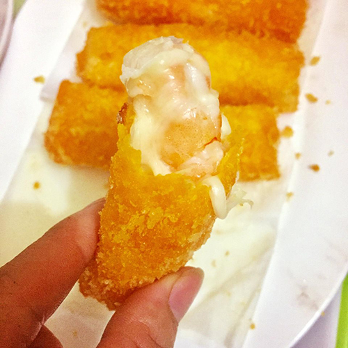 - Trải bánh tráng sau đó lần lượt cho phô mai rồi đến tôm vào và cuộn chặt tay lại.