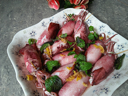- Nhồi phần thịt vào trong mình mực, để râu mực ngoài cùng và dùng tăm ghim lại.