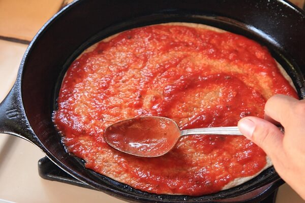 - Quét nước sốt cà chua vừa đủ để chừa lại mép ngoài của bánh