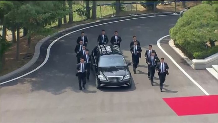 Vừa qua đội hình cận vệ của Kim Jong-un lại gây ấn tượng mạnh với TG khi họ có màn hộ tống chiếc ô tô của Kim Jong-un . Theo đó 12 người chạy bộ theo xe để đảm bảo sự an toàn cho Kim Jong-un. Đây là 1 lực lượng cực thiện chiến mà không phải ai cũng dễ gì có được . Ngày 27/4, nhà lãnh đạo Triều Tiên Kim Jong-un lần đầu tiên đặt chân sang biên giới Hàn Quốc tham dự Hội nghị Thượng đỉnh liên Triều. Ông Kim Jong-un xuất hiện nổi bật dưới sự bảo vệ nghiêm ngặt của đội cận vệ dày đặc.