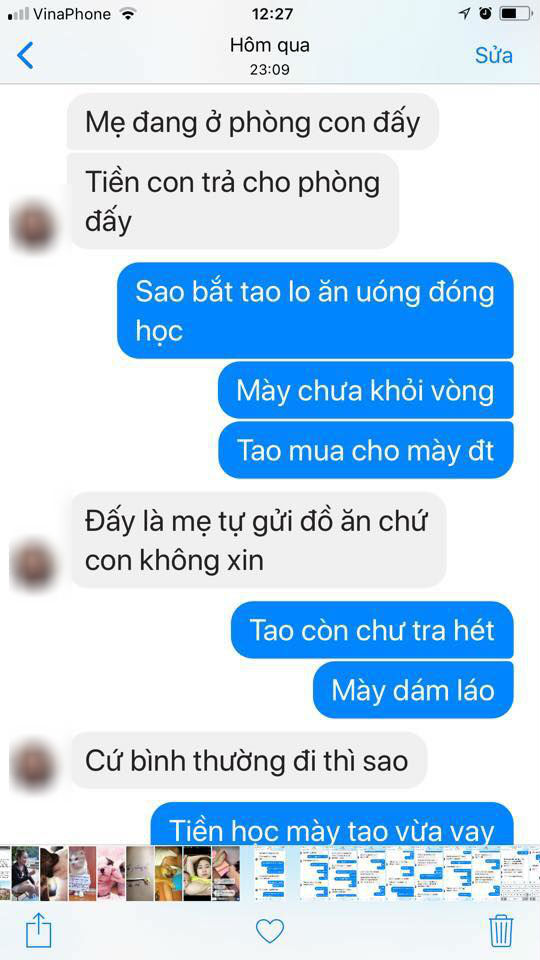 Tôi làm trong nhà nước lương có được bao nhiêu đâu? Thằng kia tôi có gặp nói chuyện đàng hoàng hỏi có lấy con gái tôi không, nó đã trả lời không. Mà giờ con gái tôi hy vọng, kỳ vọng… Hỏi làm sao tôi không ấm ức khi hàng tuần gửi đồ lên nuôi 1 thằng ăn bám như vậy. Giờ con gái tôi chửi cả mẹ đẻ xong quay sang thách thức, thậm chí còn đuổi tôi ra khỏi phòng trọ tôi thuê cho nó. Học đại học như vậy có đáng không con?“.