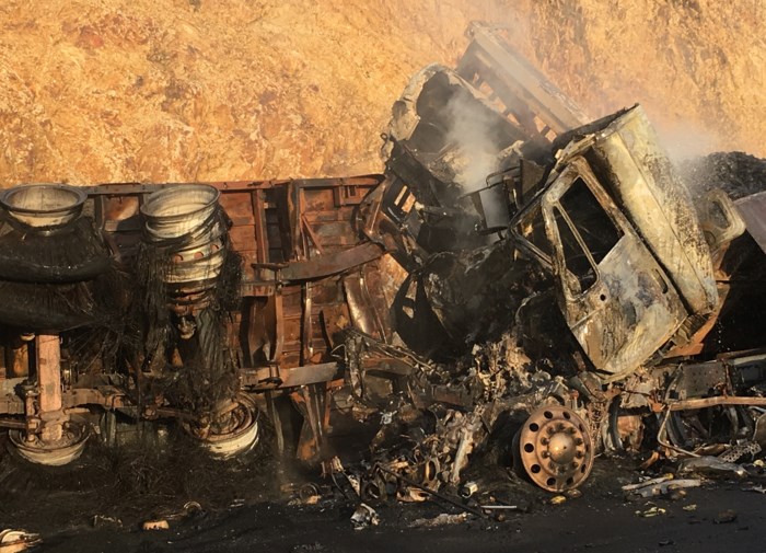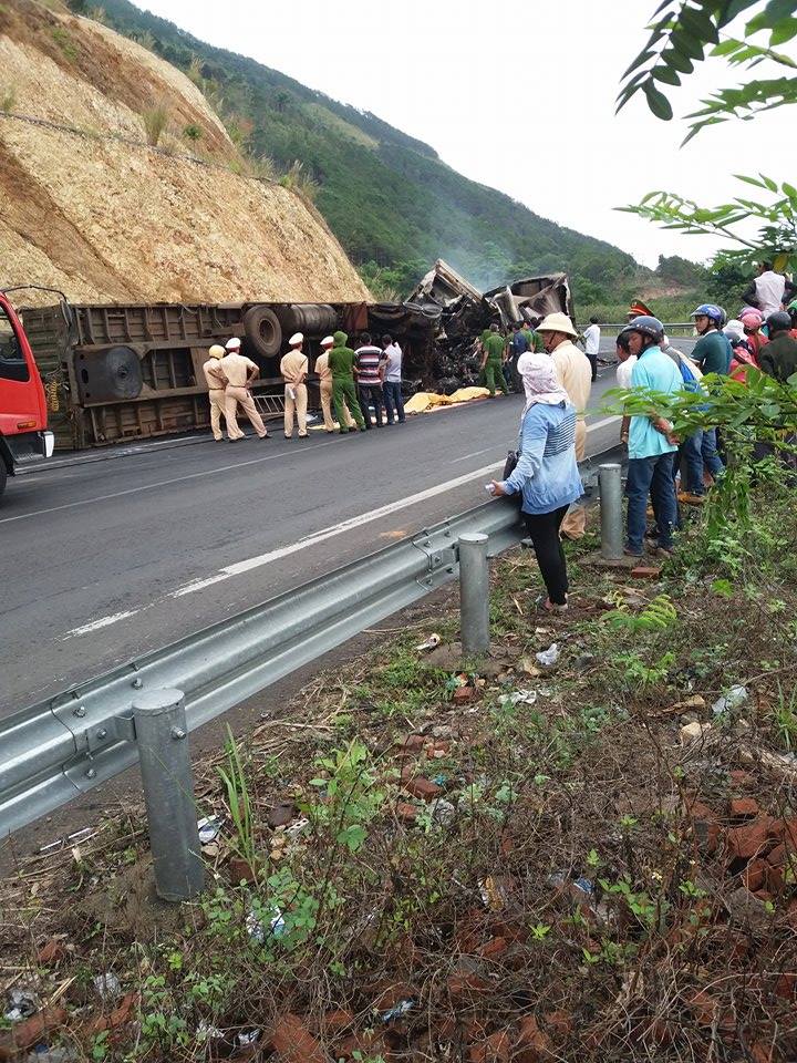Do chạy nhanh nên xe đầu kéo chở xoài khi qua đèo đã đâm vào xe đầu kéo chở gỗ khiến chiếc xe này bị lật bốc cháy. Hai người ngồi trên xe đầu kéo chở xoài bị chết cháy, còn tài xế của xe đầu kéo chở gỗ may mắn thoát được ra ngoài.