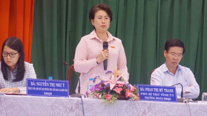 Khi tiếp xúc cử tri, bà Phan Thị Mỹ Thanh (giữa) bị phản ứng gay gắt: “Đại biểu Thanh không xứng đáng ngồi đây nữa.” (Hình: Tuổi Trẻ)
