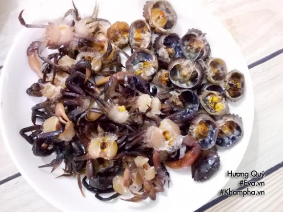Bước 1: Cua đồng mua về làm sạch, bóc vỏ mai, bỏ phần yếm hoi. Xóc thịt cua với chút muối rồi rửa lại nhiều lần. Dùng tăm nhọn khều lấy phần gạch cua để ra bát con.