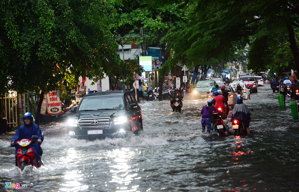 Cơn mưa lớn chiều 8/5 đã làm nhiều tuyến đường trên địa bàn quận 2, Bình Thạnh, Gò Vấp... bị ngập sâu. Tại phường Thảo Điền, quận 2, một số tuyến đường như Quốc Hương, Tống Hữu Định, số 4... chìm trong nước nhiều giờ.