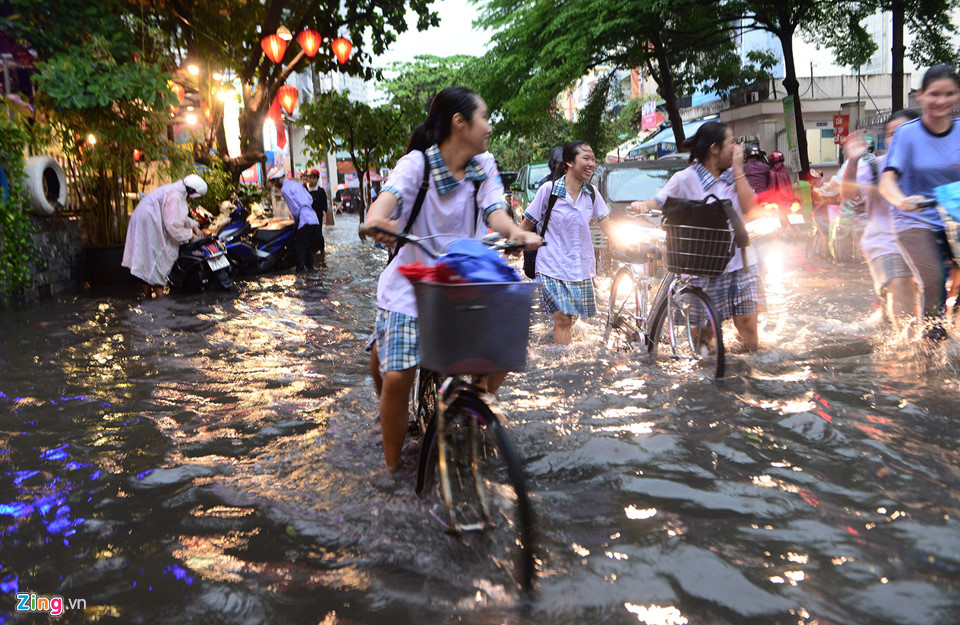 Trời mưa, đường ngập sâu vào giờ tan tầm nên nhiều học sinh bị ướt hết quần áo, lội về nhà giữa "biển nước".