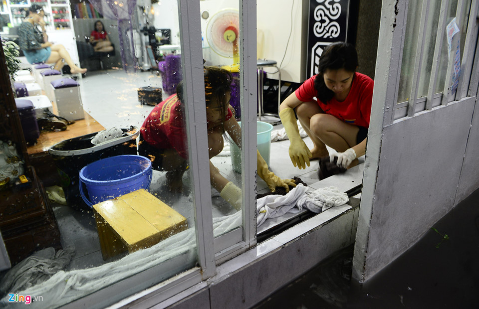Nhiều hộ dân, cửa hàng hai bên đường phải che chắn, lau chùi mỗi khi nước tràn vào.