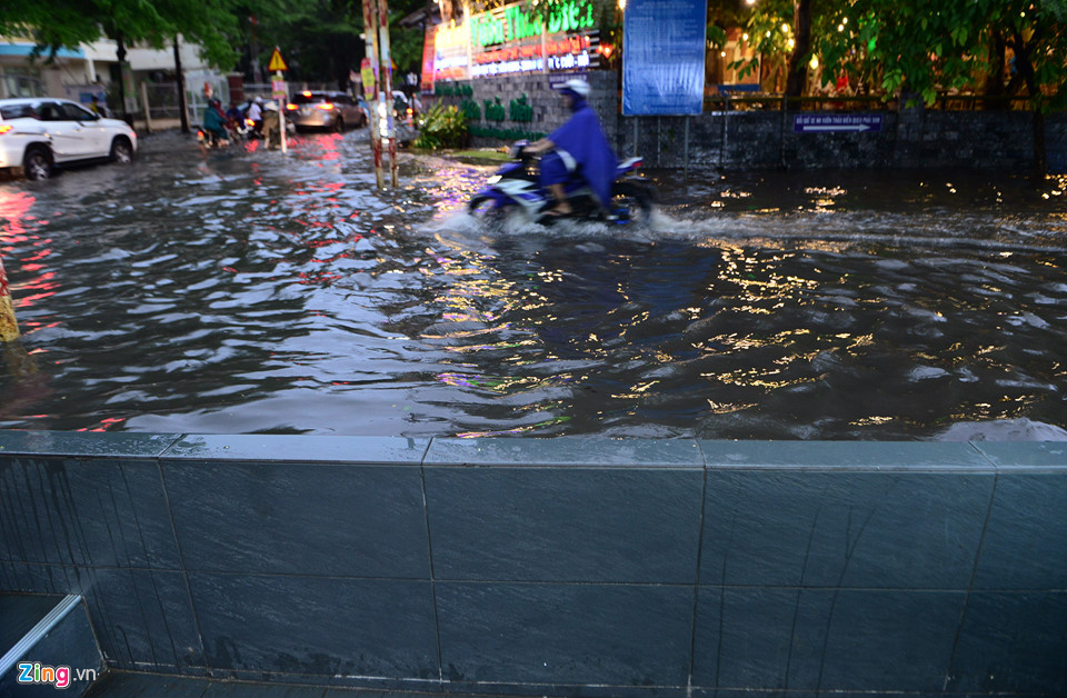 Đoạn đường khá trũng nên một số cửa hàng xây bờ chắn sóng, phòng khi đường ngập nước. Đến 18h cùng ngày, khu vực này còn mênh mông nước, người dân di chuyển vẫn còn khó khăn.