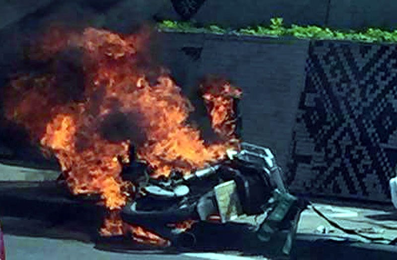 Một chiếc xe máy đang đi trên đường bỗng nhiên bốc cháy. Sự việc xảy ra vào sáng nay tại Hà Nội. Một lãnh đạo Đội CSGT số 2 – Phòng CSGT – đường sắt – đường bộ- Công an TP Hà Nội xác nhận.