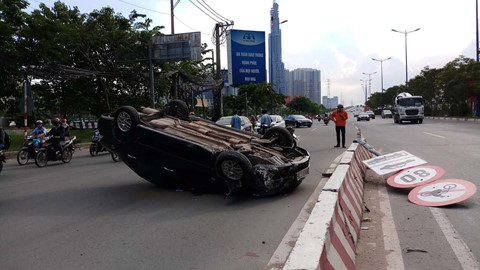 Tại hiện trường, ô tô bị hư hỏng, nằm lật ngang trên xa lộ, một biển báo giao thông bị húc ngã. Vụ việc làm nam tài xế bị thương và đã rời khỏi hiện trường ngay sau đó. Nhận tin báo, Công an Q.2 có mặt điều tiết phân luồng giao thông, xử lý hiện trường.