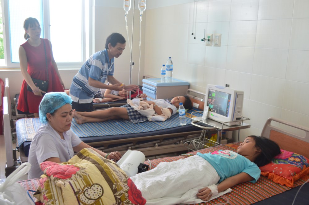 Sau khi dùng 2 loại thực phẩm trên được khoảng 10 phút, 19 học sinh có triệu chứng đau bụng, ói mửa… được nhà trường đưa đến Bệnh viện Sản Nhi Quảng Ngãi cấp cứu.