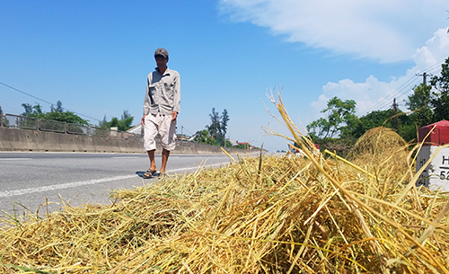 Tình trạng tương tự cũng diễn ra ở tuyến đường đi mỏ sắt Thạch Khê (huyện Thạch Hà). Nông dân sau khi thu hoạch lúa dưới ruộng đem tuốt tại chỗ, sau đó trải bạt, dùng những viên đá cỡ lớn đè lên để bạt không bị gió thổi bay, rồi đổ lúa vào phơi.