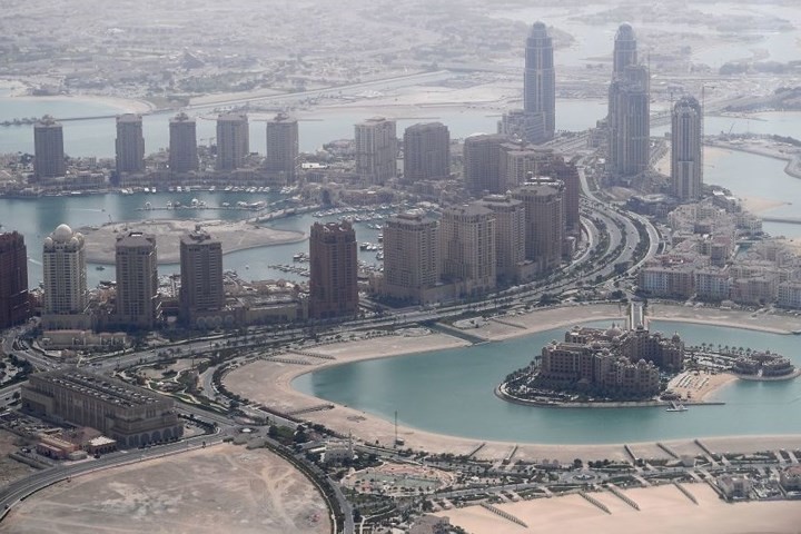 Máy bay bay qua thủ đô Doha. Dưới bụng phi cơ có in chữ “Qatar”.