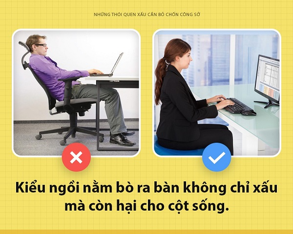 Ai trong chúng ta cũng muốn khi làm việc được ngồi trong tư thế thoải mái nhất. Thế nên, ngồi thoải mái không có nghĩa là bạn "nửa nằm nửa ngồi", nằm bò ra bàn hay ngả ra phía sau quá nhiều... Thói quen này không chỉ khiến hình ảnh của bạn trở nên xấu xí hơn mà còn gây ảnh hưởng nhiều đến cột sống của bạn nữa đó.