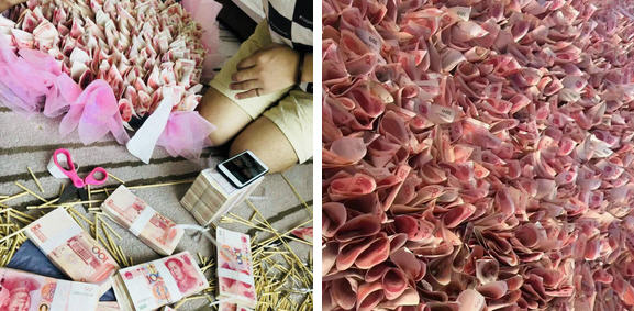 Trong số những hình ảnh được lan truyền trên mạng xã hội, cặp đôi trẻ đứng trong một căn phòng VIP tại tầng 61 của một khách sạn hạng sang ở thành phố Trùng Khánh. Cô gái trẻ mặc chiếc đầm trắng lộng lẫy đứng trên bục thủy tinh, ôm bó hoa được tạo nên từ các tờ tiền mệnh giá 100 tệ (hơn 300.000). Bên cạnh đó là một mô hình trái tim từ hàng trăm ngàn tờ tiền tương tự.