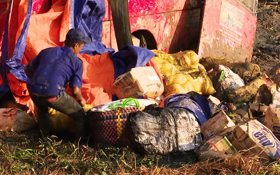 Đồ đạc, hành lý của hành khách bị văng ra ruộng khi chiếc xe lật nghiêng
